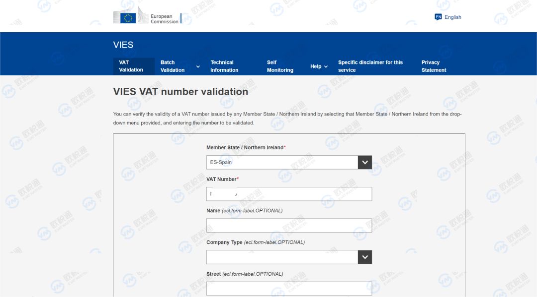 可以通过VIES增值税信息交换系统验证是否已经注册了欧盟税号,以及该公司的交易是否符合免征增值税的要求,欧盟税号在VIES网站查询到生效即可使用。其格式通常以“ES”开头,后跟西班牙本土税号,例如“ESN1234567D”。
