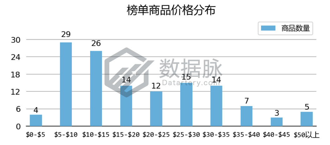 上周 Pet Supplies 品类 Movers & Shakers 榜单商品最高价$79.79, 最低价$0.01,平均价格$20.77。骆探长(shujumai.com)发现,在上榜的商品中, 骆探长(shujumai.com)发现,其中价格位于$5.00-$10.00与$10.00-$15.00两个价格段中的商品同样多,占了上榜商品总数的21.09%;有14.14%的上榜商品数定价于$15.00-$20.00价格段;此外,上周19款商品价格超过了$50.00,占上榜商品总数的4.71%。与前两个榜单类似,相比于上期分析,该周进榜Movers & Shakers榜单商品的平均价格持平。