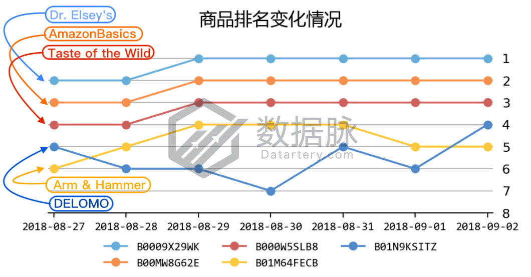 可以看到,在上周Pet Supplies品类的Best Seller榜单中, 品牌Dr. Elsey's的猫砂一周五度登顶榜首,以1.29的平均排名成绩位列综合排名首位;