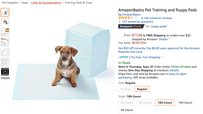 亚马逊自营品牌AmazonBasics的宠物狗尿垫产品一周内五度占据榜单第二,以平均排名2.29位列综合排名第二位;
