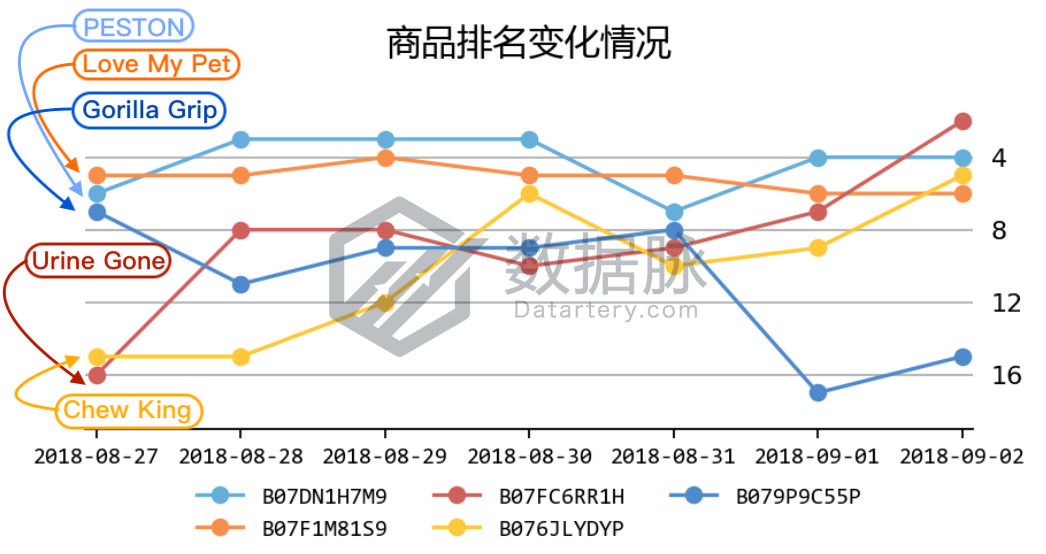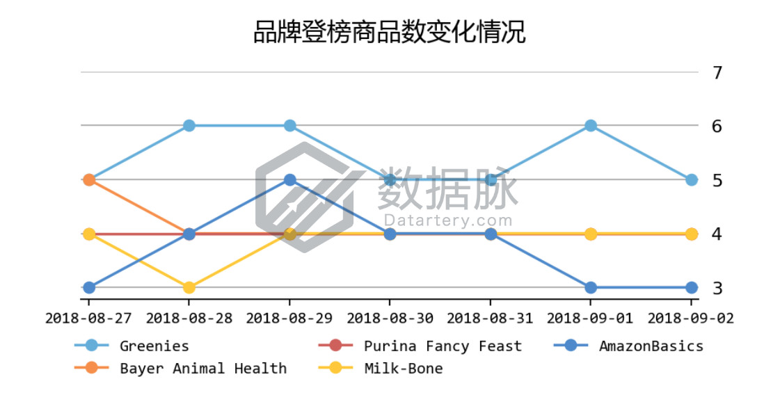 可以看到,在上周Pet Supplies品类的Best Seller榜单中, 品牌Greenies凭借领先其他品牌的每日登榜商品数,以一周总登榜次数38次的成绩位列品牌综合排名第一。此外骆探长(shujumai.com)注意到,品牌Bayer Animal Health、品牌Purina Fancy Feast、品牌Milk-Bone、品牌AmazonBasics之间竞争激烈,分别取得了29、28、27、26次进榜机会,位列品牌综合排名的第二、三、四、五位。