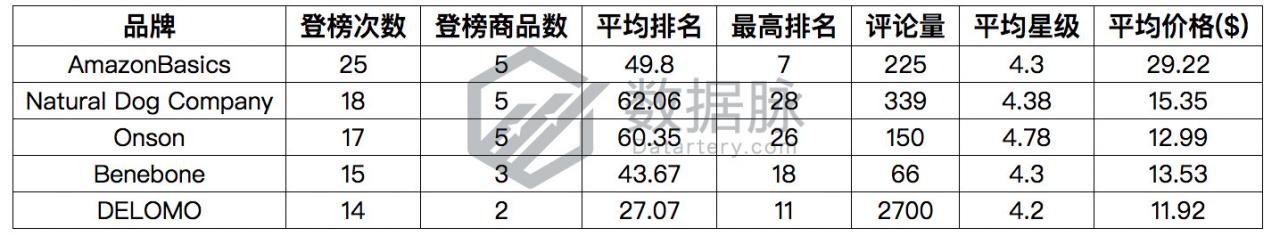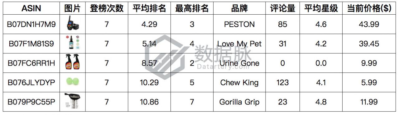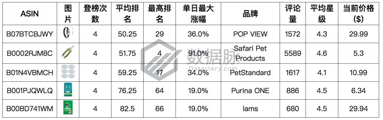 可以看到,在上周Pet Supplies品类的Movers & Shakers榜单中, 综合排名前五的商品均只登榜四次;品牌为POP VIEW的宠物狗防吠项圈以平均排名50.25位列综合排名首位;