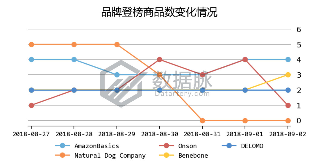 可以看到,在上周Pet Supplies品类的Hot New Releases榜单中, 品牌AmazonBasics凭借稳定的发挥,以登榜25次位列品牌综合排名第一位;品牌Natural Dog Company前三日登榜商品商品数卓绝,后期数量跌至低谷,以登榜18次位列综合排名第二;品牌Onson、品牌Benebone、品牌DELOMO在上周分别取得了17、15、14次登榜机会,位列综合排名第三、四、五位。