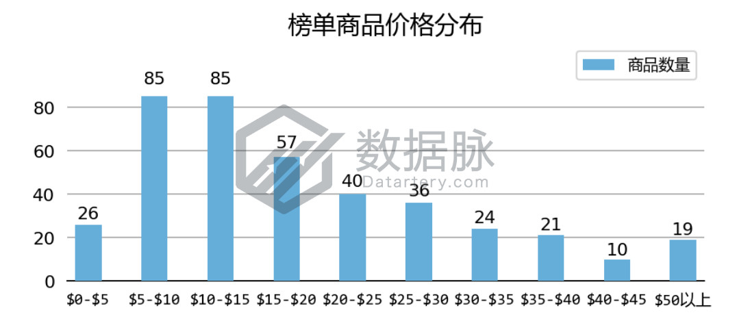 上周 Pet Supplies 品类 Best Seller 榜单商品最高价$64.95, 最低价$0.99,平均价格$21.28。骆探长(shujumai.com)发现,在上榜的商品中, 上榜商品主要集中定价于$5.00-$15.00价格段,其中有22.48%的上榜商品价格分布在$5.00-$10.00区间,同时定价于$10.00-$15.00区间的上榜商品也占据了品总数的20.16%,骆探长(shujumai.com)发现,相较于前几期分析,该周进榜商品的平均价格有所回升,此外,上周共有5款上榜商品的定价超过了$50.00,占上榜商品总数的3.88%。