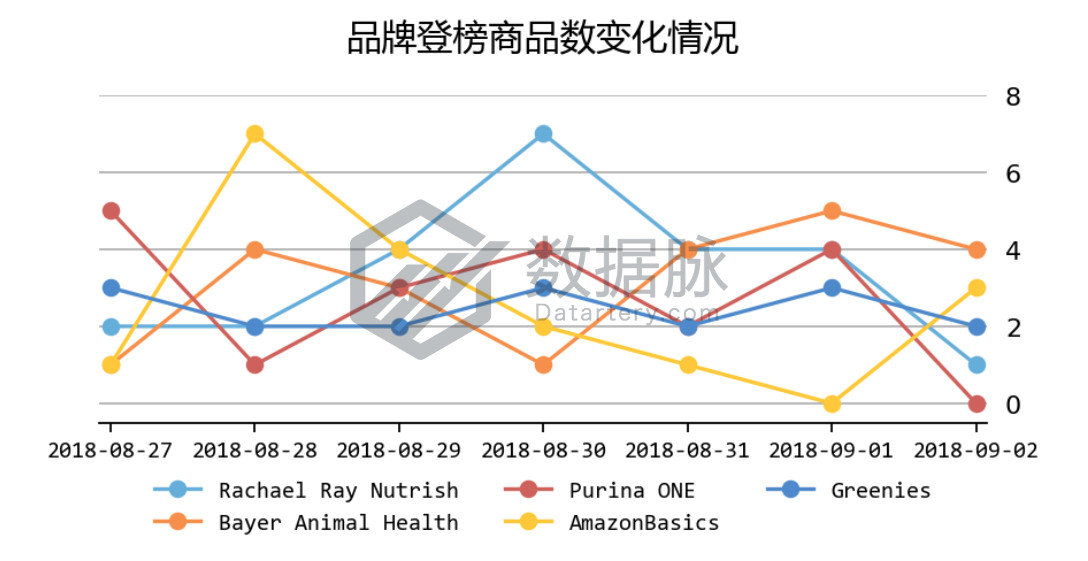 可以看到,在上周Pet Supplies品类的Movers & Shakers榜单中,品牌Rachael Ray Nutrish与品牌Bayer Animal Health均有13款商品登榜,分别凭借登榜24、22次,位列品牌综合排名第一、二位;骆探长(shujumai.com)也同时注意到,品牌Purina ONE、AmazonBasics、Greenies同样凭借登榜19、18、17次,位列综合排名第三、四、五位。