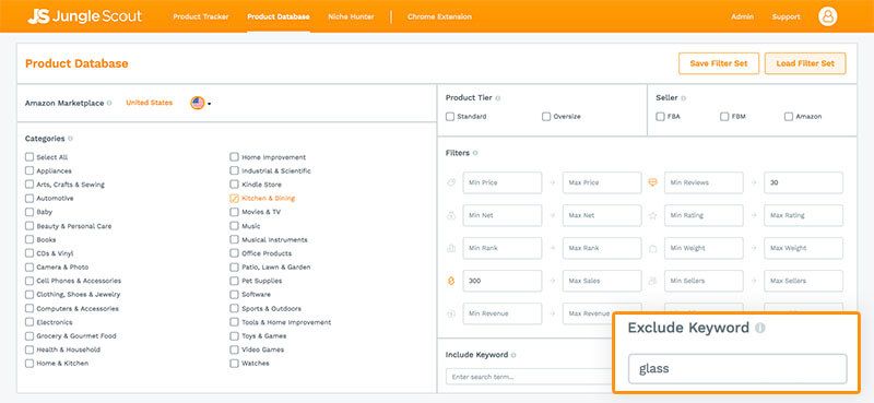 当你开始浏览搜索结果时,会注意到一些不在你考虑范围内的产品,比如玻璃制品或者某些品牌用品。你可以将它们排除,在排除关键词(Exclude Keyword) 那里添加你想要排除的内容。这会迅速缩小搜索范围,关键词之间可以用英文逗号分隔,加多少都可以。