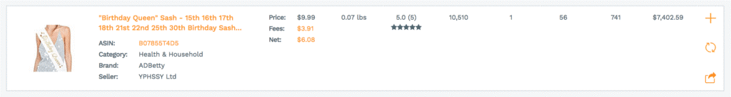我们用以下为筛选条件找到了这款Birthday Queen Sash,它有每月超过7,000美元收入的潜力,机会分值(Opportunity Score)为7。