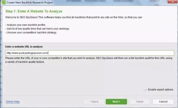 好了,现在我们就要查看http://www.podcastingpassion.com/ 这个链接有多少个外部链接。利用工具SEO SpyGlass