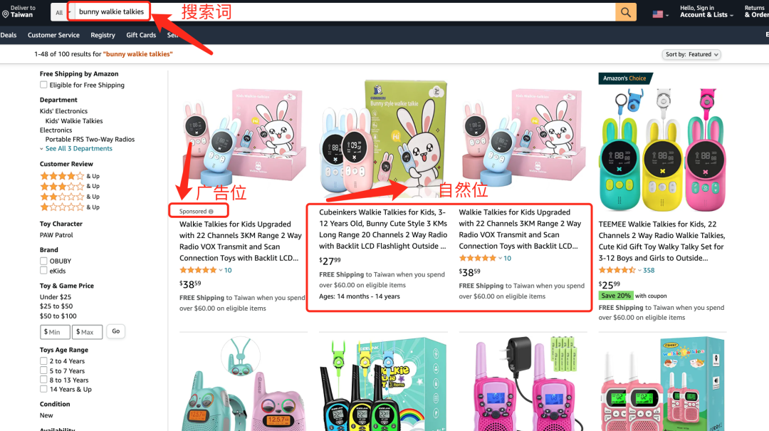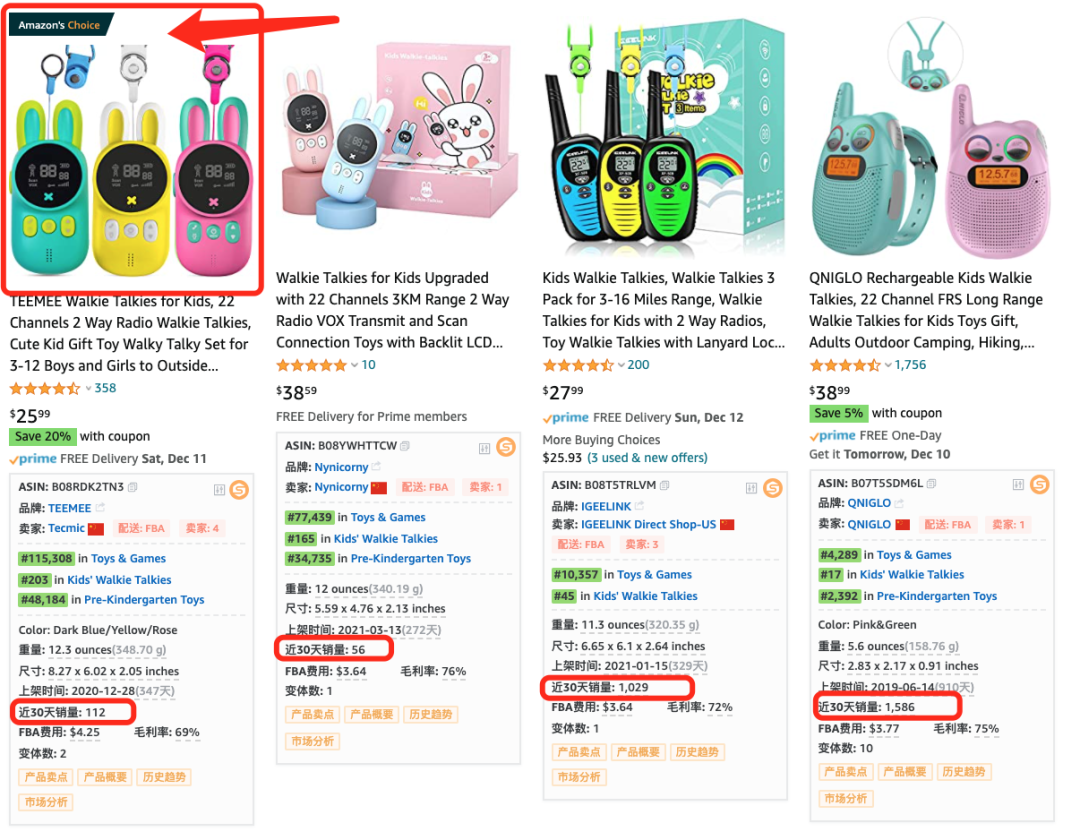 举例:这款产品是在关键词:walkie talkie for kids下获取Amazon Choice的标识。