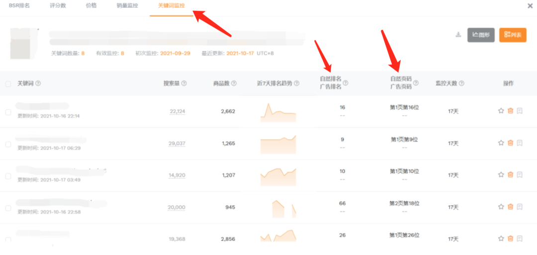 我们可以将我们产品的核心关键词进行收录,然后通过关键词监控查看我们关键词的自然位和广告位的具体排名。