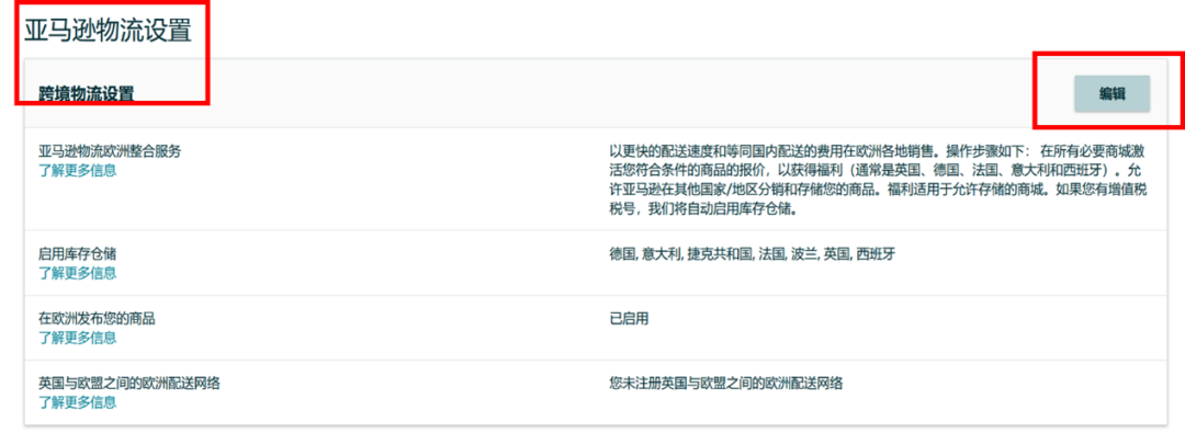 满足以上要求的卖家,请前往卖家平台上的亚马逊物流设置页面,选择您想要放置库存的国家。届时,您的所有符合条件的ASIN都将成功加入泛欧库存加速器(COS),使用亚马逊物流欧洲整合服务(Pan-EU)。