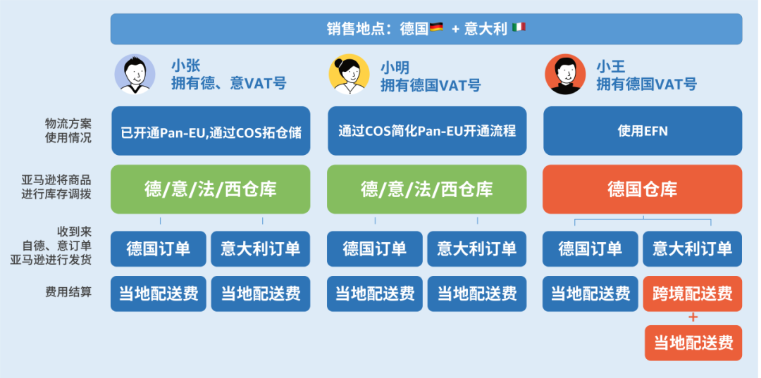 注册德国1国VAT号,未开启Pan-EU,开通了欧洲配送网络(EFN)。当小王收到德国订单时,仅需支付当地标准配送费;收到意大利订单时,需支付当地标准配送费+跨境配送费。