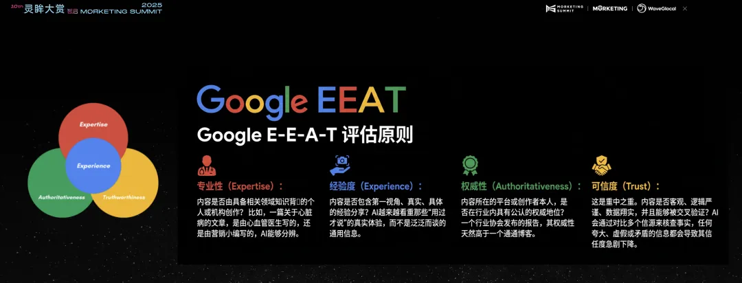 至于用什么样的内容获得AI信任,目前没有绝对标准答案,但可以参考Google今年提出的EAT评估原则,它包含四个核心维度: