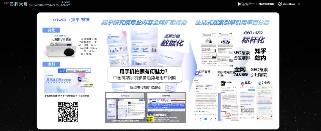虽然知乎一直在试图与客户共创GEO的一些合作,但我们也仍在学习中。在与客户的合作里,有一个意外惊喜的案例:知乎智慧研究院曾与vivo开展过一次合作,这次合作最开始没有针对GEO,而是希望联合挖掘知乎站内懂摄影、懂影像且爱分享的专业人士,向他们发起调研,最终形成一份白皮书,来告诉大家用手机拍照是很有魅力的,吸引更多人用手机拍出好看的照片。