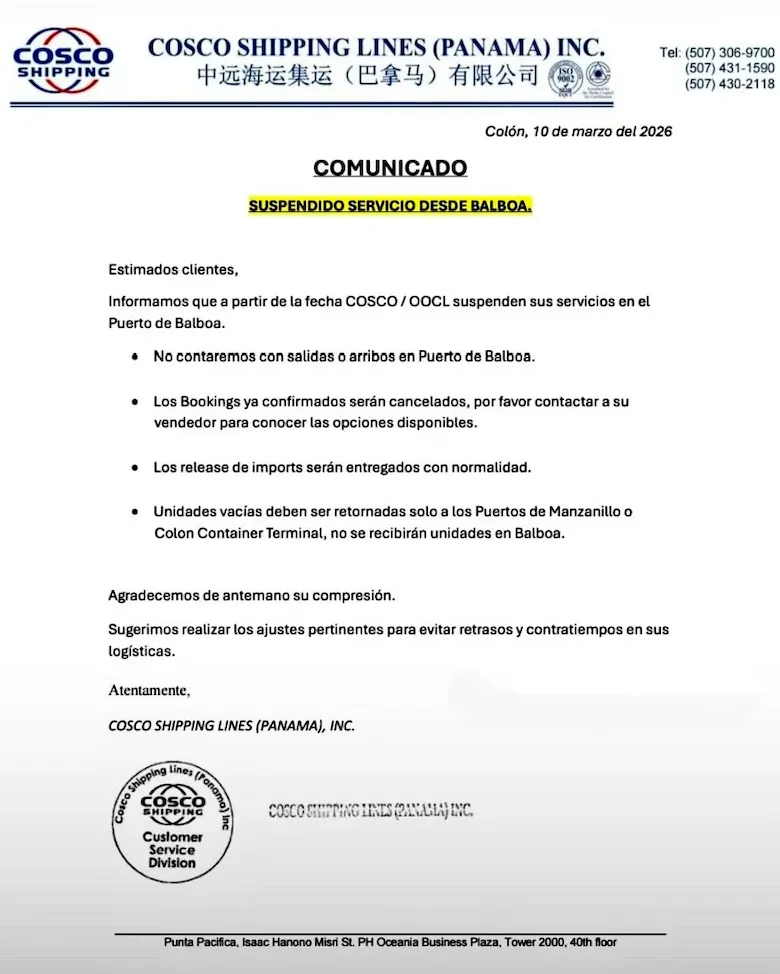 近日,中远海运集运发布客户通知称,自3月10日起,公司及旗下东方海外(OOCL)将暂停在巴拿马巴尔博亚港(Balboa)的全部业务操作,包括所有到港和离港作业。通知发布后相关措施已立即生效。