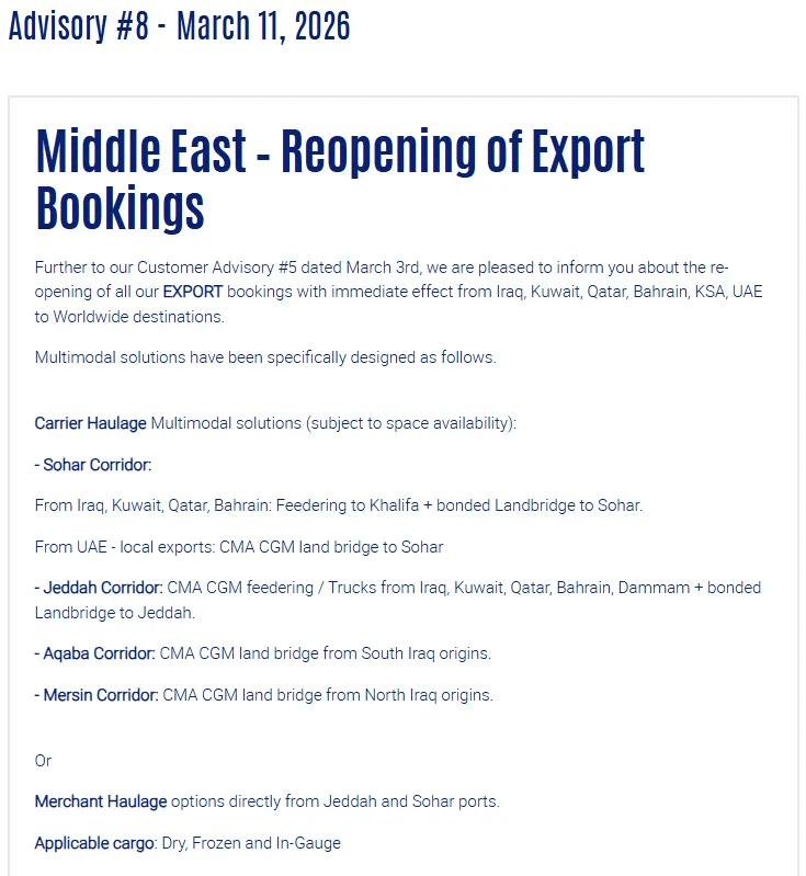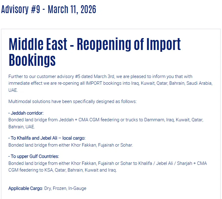 3月11日,法国航运公司达飞轮船发布最新客户公告,宣布即日起恢复中东地区进出口货物订舱服务。此次恢复覆盖伊拉克、科威特、卡塔尔、巴林、沙特阿拉伯及阿联酋六个主要市场,适用于干货箱、冷藏箱以及标准集装箱货物。