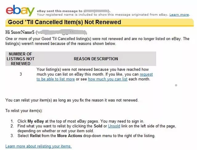 第一,你无法再上架了,也无法再补货了。第二,更要命的是,如果GTC的刊登到期了,因为没有额度是无法续刊的,你会收到下面这样一份信。