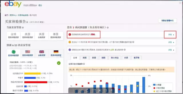 通过上图可以看到我目前的物流表现为限制,在这个骗子搞我前,我大号所有的站点都是Top Rated Seller,中差评都非常少。