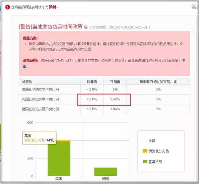 我英国仓的物流不良交易比例超了,要求是3%,我的是3.46%,就是因为这个我被限制了!其中,我在英国总共有300多笔交易,物流有问题的是14笔,13笔是那个骗子贡献的。