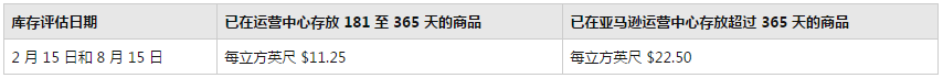 对于已经存储超过1年(365天)的产品,还会额外生效一个最低长期仓储费标准。如果存储的商品体积很小,导致按体积计算后每件产品的收费小于$0.5时,将会按照$0.5/每件的最低费用来收取长期仓储费。
