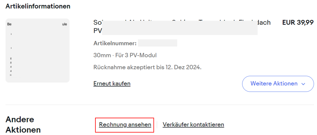 eBay目前只支持买家下载增值税的订单发票。指导买家进入订单详情,在“Andere Aktionen” (Other actions)点击“Rechnung ansehen” (View invoice)。