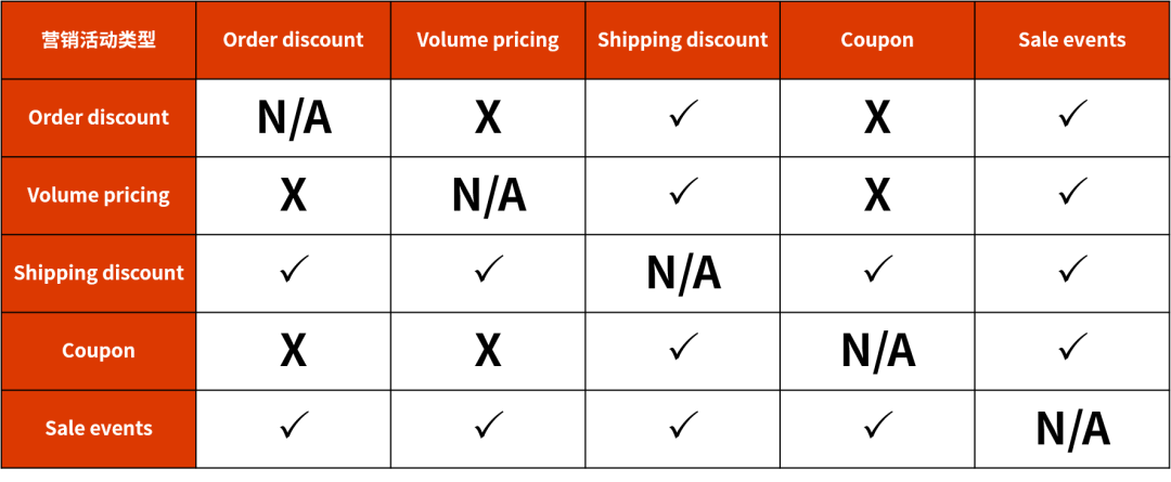 N/A-不适用/✔-可以叠加使用/X-不可以叠加使用