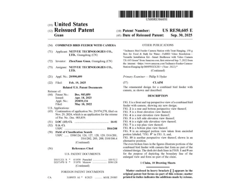 涉案专利号为:USRE50605,主要保护“带摄像头的鸟类喂食器”整体外观。该案目前共有14家店铺涉案,建议相关品类卖家尽快排查并下架高危产品,以免侵权导致TRO冻结。