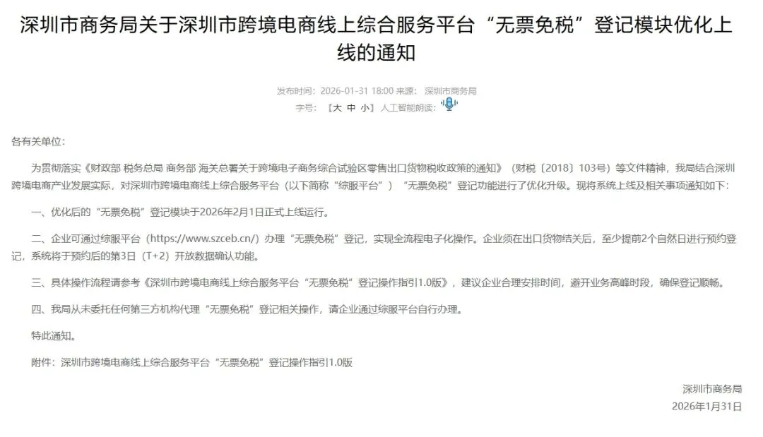 2026 年 2 月 1 日,深圳市跨境电商线上综合服务平台 “无票免税” 登记模块优化版正式上线。