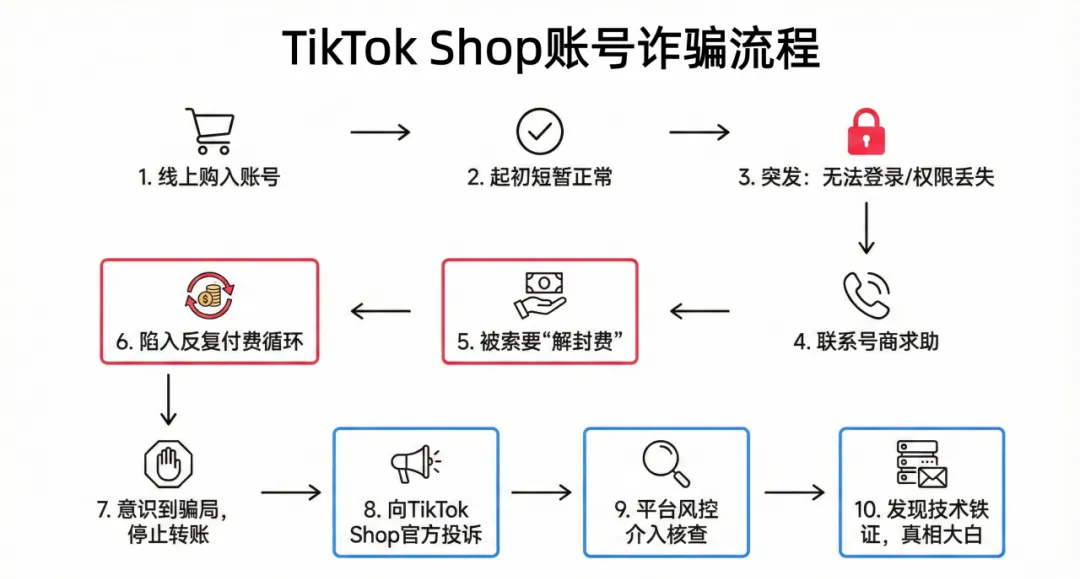 为了让卖家不断掏钱,每当账号恢复不久后,又会莫名其妙地无法登录,卖家们只能一次次地找回,一次次地转账,陷入“账号倒卖 - 反向找回 - 重复收费”的诈骗循环。直到多名商家向TikTok Shop投诉店铺账号被盗才得以发现。