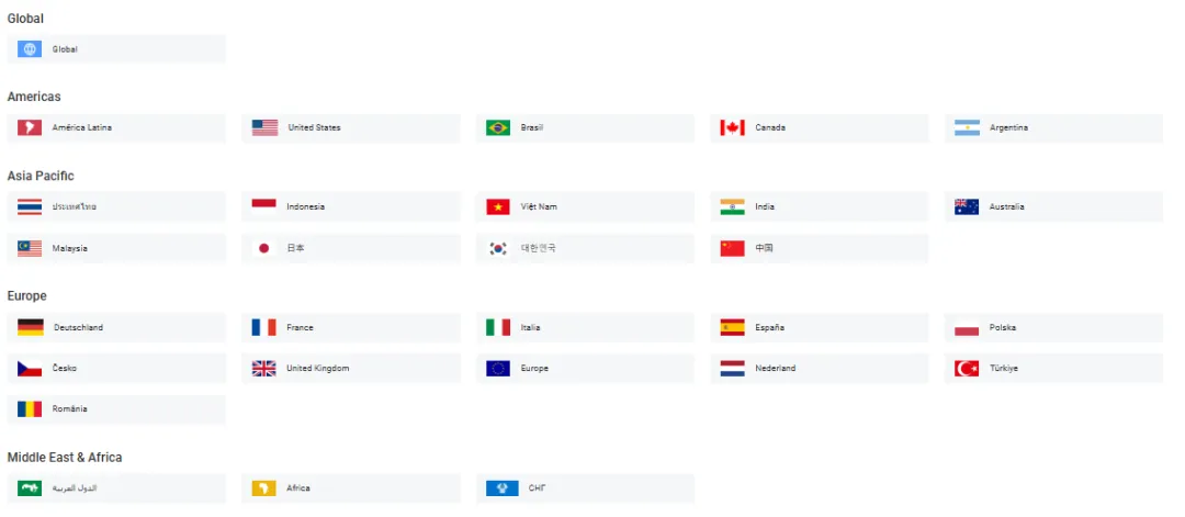 全球主号 + 区域矩阵,