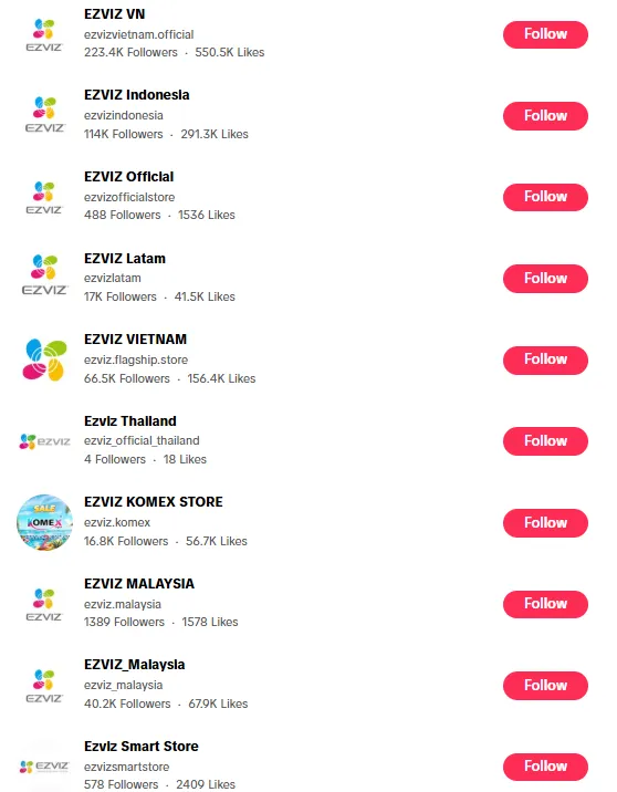 • TikTok 分区运营:针对越南、印度尼西亚、泰国、马来西亚、中东等市场开设独立账号,内容完全适配本地偏好。例如越南账号 @EZVIZ VN(22.34 万粉丝)主打生活化情景剧,弱化硬广;马来西亚账号 @EZVIZ.Malaysia(4.02 万粉丝)聚焦家庭日常场景,强化产品实用性。