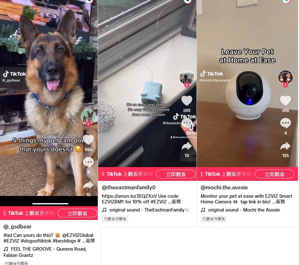 一个值得注意的细节是,EZVIZ 的 TikTok 主号粉丝数并不多,但它并未放弃这个阵地。相反,它通过与大量宠物、家庭、生活方式类的 TikTok 创作者合作,将产品植入真实生活场景中。这恰恰是很多品牌容易忽略的一点:短视频平台的影响力,不只看官号粉丝量,更要看它在创作者生态中的渗透率。