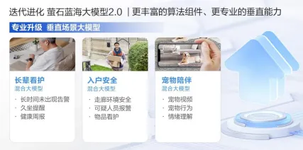 双核驱动:AI 大模型(萤石蓝海)+ 萤石云平台; 五大核心品类:智能摄像机、智能入户、智能服务机器人、智能控制、穿戴设备;