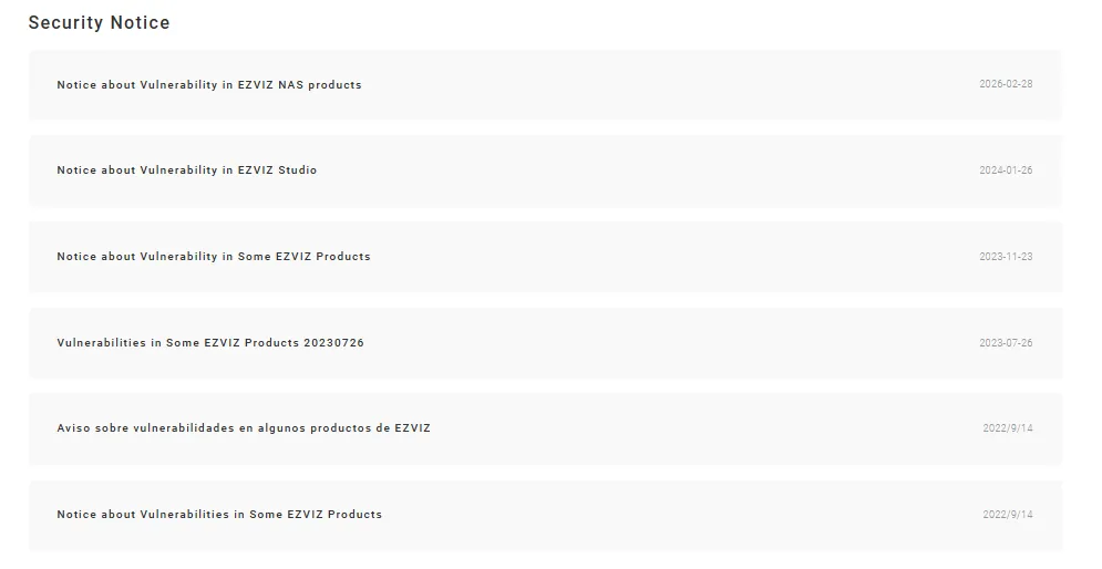 2022 年 Bitdefender 披露设备漏洞、NVD 收录 CVE 后,萤石第一时间发布漏洞通知,通过云平台 + 固件更新完成修复,同步建设Trust Center、Security Response Center、隐私控制页面,公开透明回应市场质疑。
