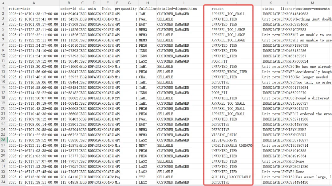 于是,我们后台下载亚马逊物流的买家退货分析: