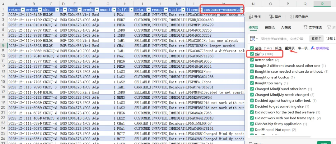 很多卖家家都会看M列的 “customer comment"再去找到细分原因看原因占比情况。
