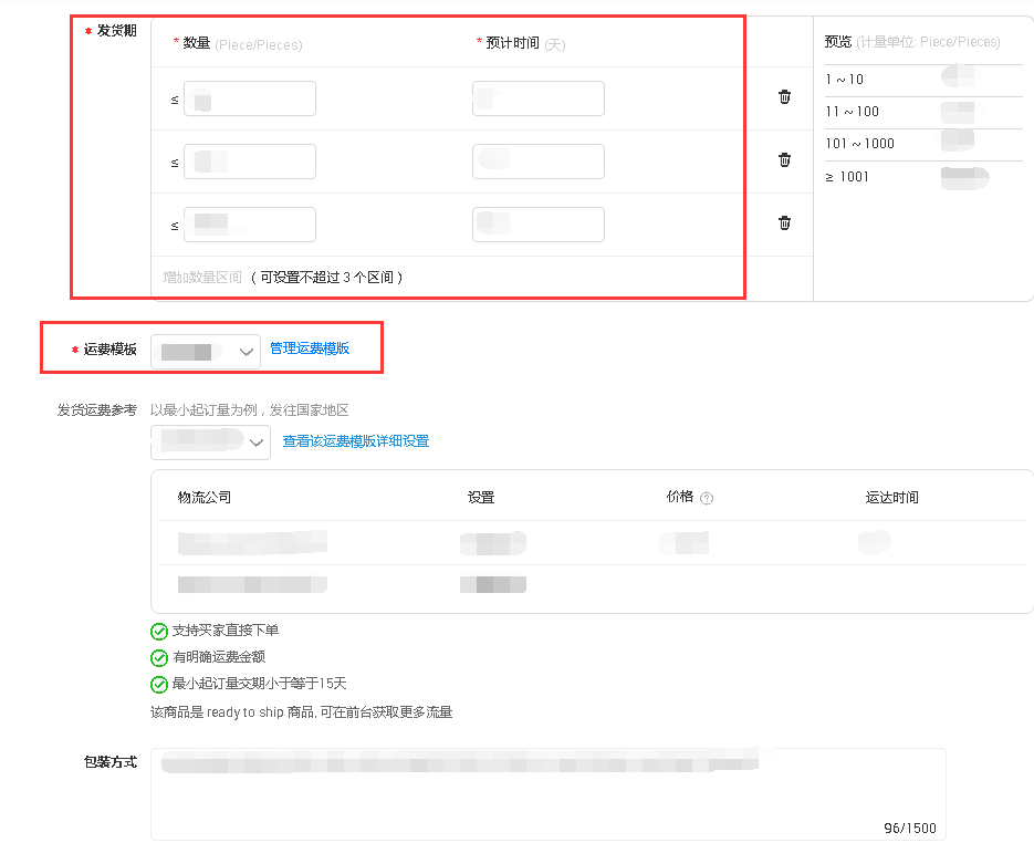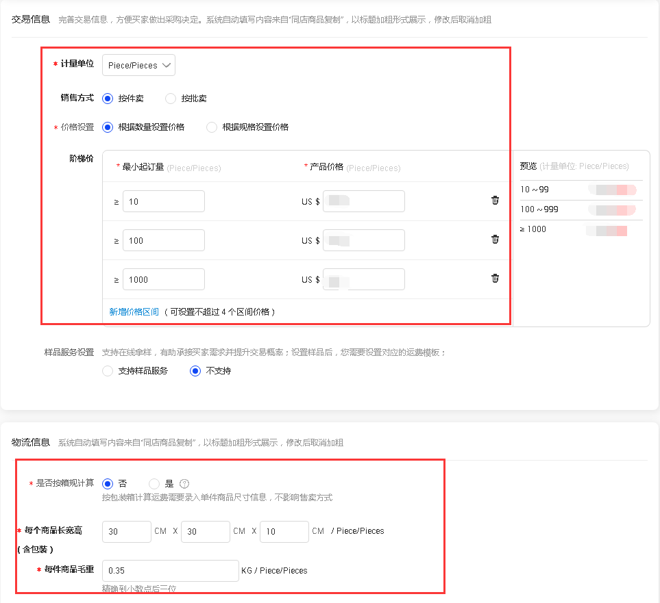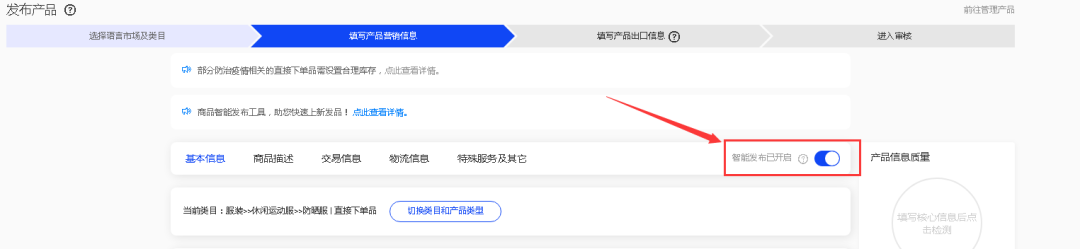 其中开启智能发布后,“交易信息”、“物流信息”、“发货期”部分,系统会自动复制同类产品,如有不同,需要自行更改。