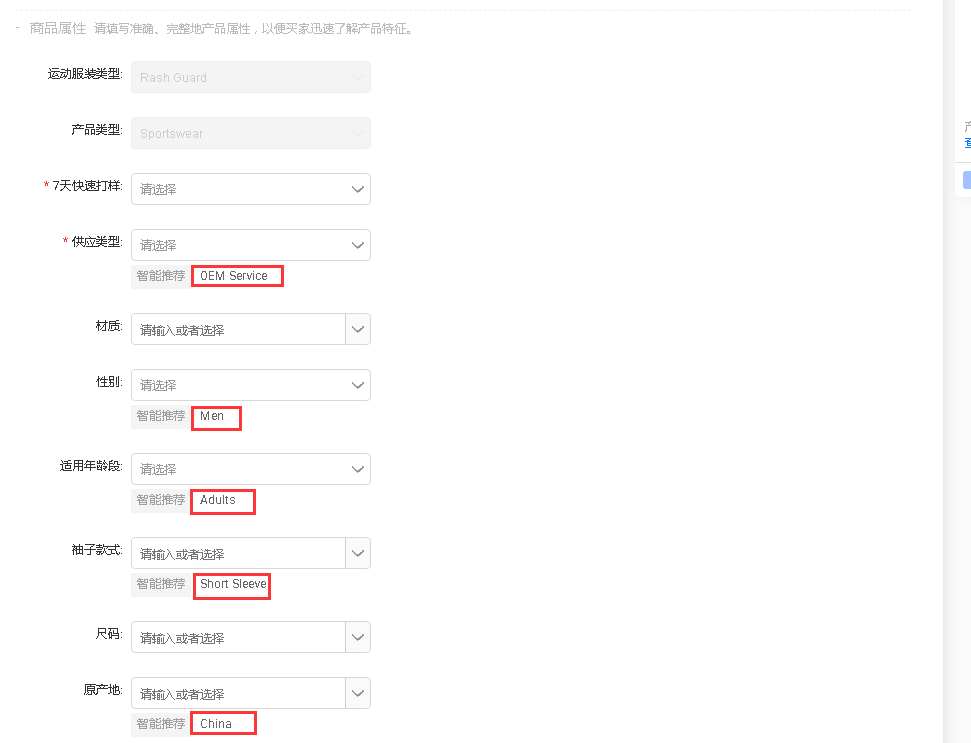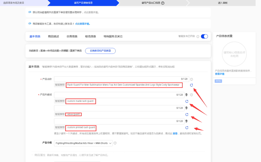 快速发布新品是通过智能推荐完成的,智能推荐是根据平台大数据,推送产品的展示信息在输入框下方,我们可以自行参考后决定是否采用,其中包括:标题、关键词、系统属性。