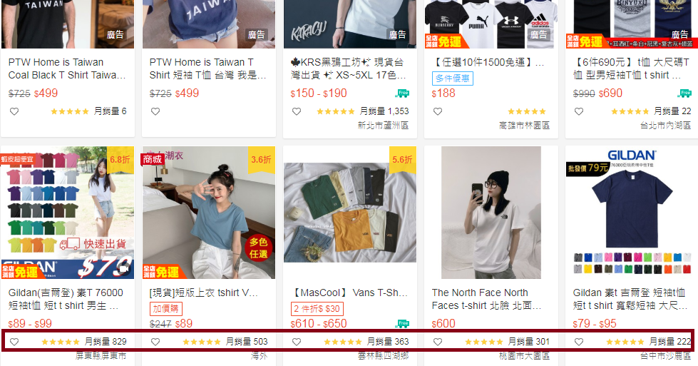 在你店铺所在站点,我们搜索商品T恤(各站点搜索词不一样),在商品展示页面点击热销,除去第一排的广告商品,往下展示的就是这个类目下,卖的最火热的款式了。