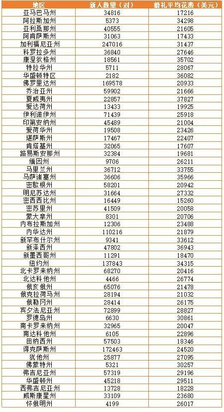 每年每个州都有成千上万对情侣结为新婚夫妇,而且花费不菲。下面是《商业内幕》(Business Insider)整理的2018年美国各州新人数量和平均婚礼花费。
