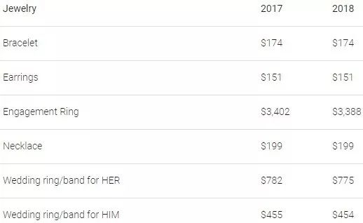 Wedding Report对美国6792份样本分析后发现,2018年每对新人的平均婚礼支出为24723美元,除了婚礼场地和宴请外,婚戒的单项支出最高,订婚戒指平均花费3388美元。
