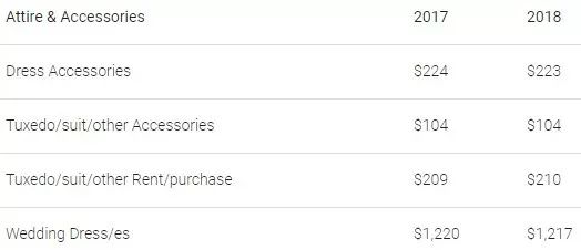 除了珠宝,服装和配饰也是花费不小的一块,2018年婚纱平均花费1217美元。