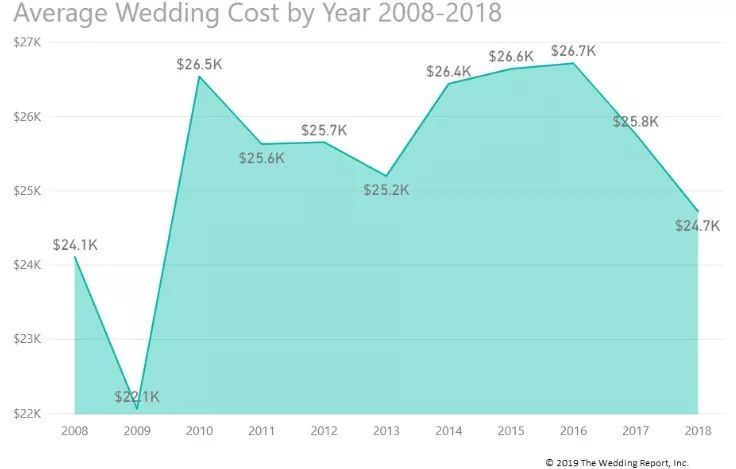虽然婚礼行业拥有一个庞大的消费市场,但Wedding Report统计数据显示,2008年至2018年美国平均婚礼支出有下降的趋势,比如2017年和2018年的支出分别为25764美元和24723美元。