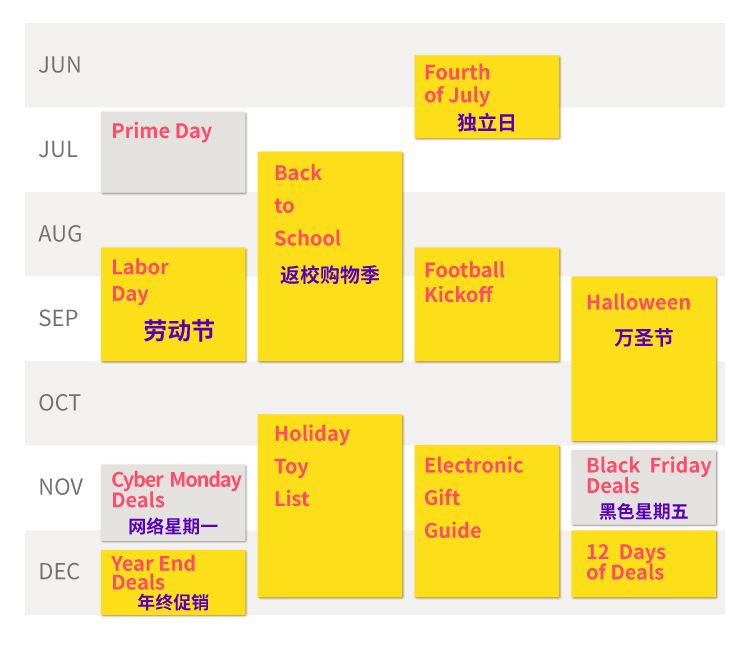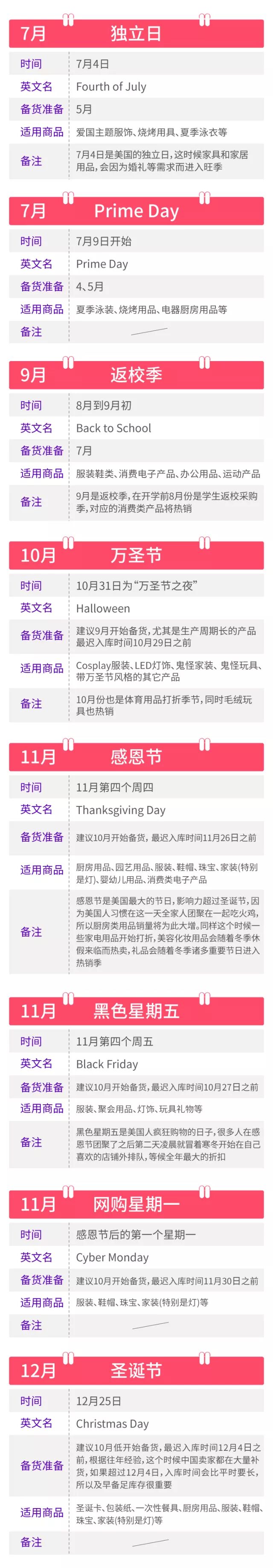 一、下半年促销节日汇总 6月之后促销不断,节日罗列如下图↓↓↓ 图-来源于网络 二、不同节日热销产品盘点 节日现场展示 << 滑动查看下一张图片 >> 从6月开始进入“潜”旺季期,亚马逊卖家要利用这些节日做好产品预热,提升排名,稳固销量。