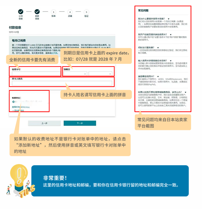6)卖家平台提交的用于支付和结算的信用卡或借记卡建议使用法定代表人信用卡或借记卡,银行账户信息必须真实有效。请勿使用虚拟卡。