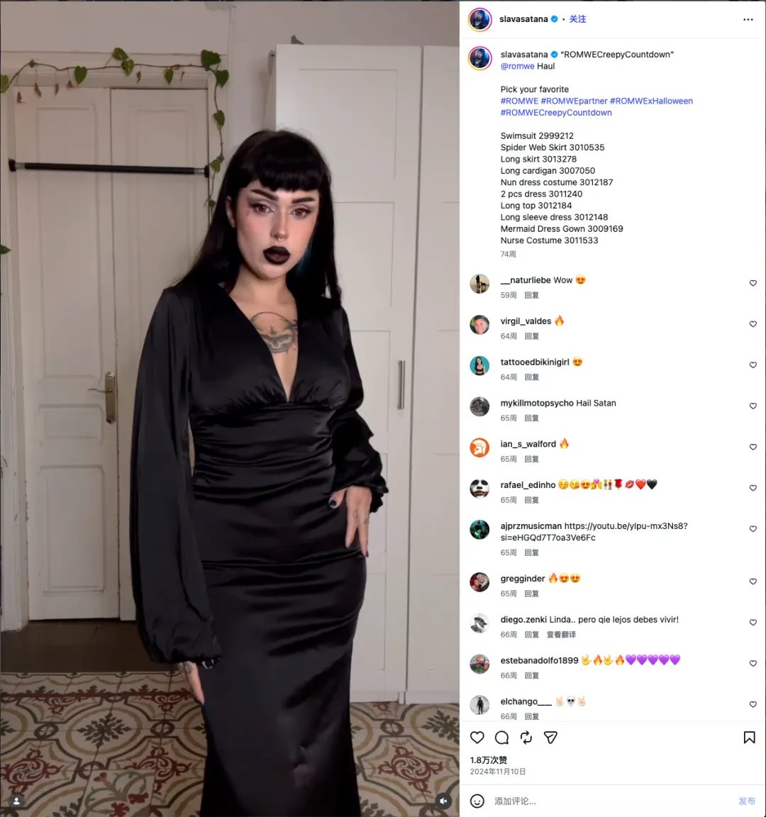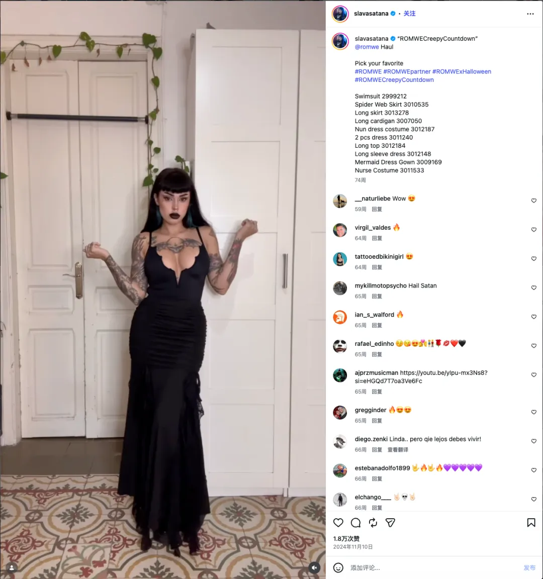 而在红人营销方面,ROMWE的逻辑也很清晰:在亚文化圈层中,社交权力是去中心化的。一个粉丝过百万的泛娱乐大V,其影响力往往不如一个只有3万粉丝、但深耕“暗黑艺术”的尾部红人。