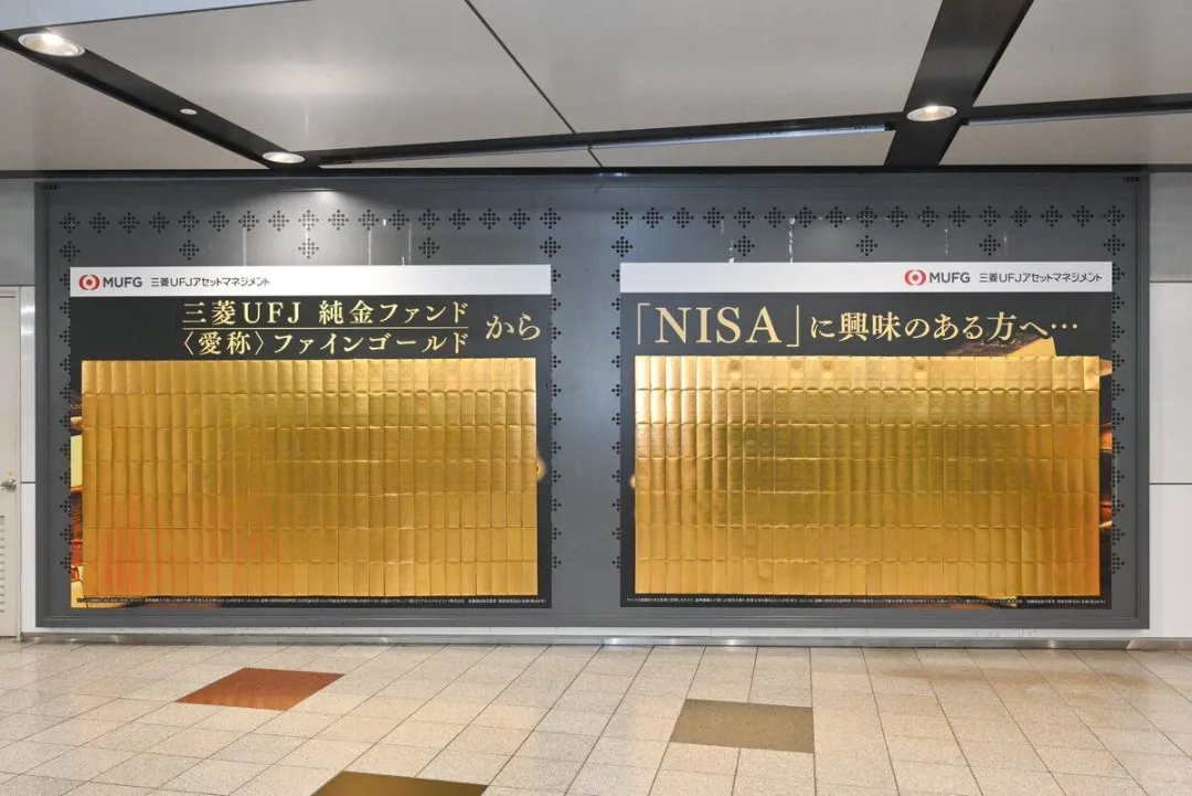 2月9日至2月15日,三菱UFJ银行为了宣传其黄金基金业务,在东京新宿站京王线3号站台,设置了一整墙的“金砖”,供路人随机领取。路人领取金砖拆开后,即可获得其中的便利贴套装。三菱UFJ用这一支「Fine Gold」广告,为自己的纯金基金理财项目宣传,重点突出其“免税黄金投资”的优势。