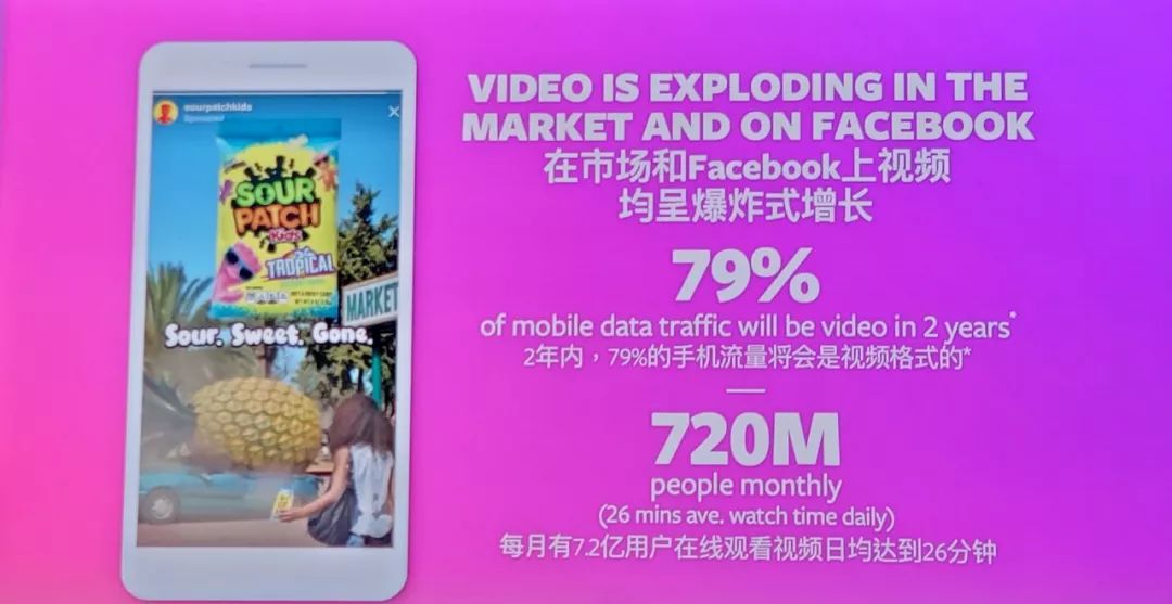 ·沟通:截止到目前,Facebook家族系列产品已经拥有27亿的月活用户,日活用户也达到了21亿。在市场和Facebook上上传视频均呈现了爆炸式的增长,预计在2年内,79%的手机流量将会是视频格式的,而每月将有7.2亿的用户在线观看视频日均达到26分钟。每天分享的快拍数量有10亿,品牌使用快拍广告形式也有300万。