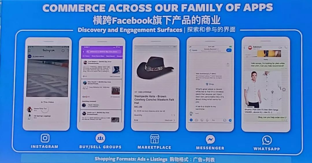 ·商业:从最早的家庭式杂货店,到后来的商场——大型零售店——便利店/药店——网页端电商,再到10几年前兴起的移动端电商,最后到今天的社交电商,皆是横跨Facebook旗下产品的商业。