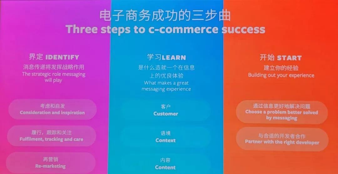 ·对话:为什么发消息对企业很重要?主要是因为人们与企业开启联系的第一步是“对话”。每日通过Facebook家族程序发送的信息数量已经达到1000亿,而“对话”创造了“两全其美”的社交商业体验:从考虑和启发,到履行、跟踪和关注以及再营销,让我们明确了消息传递是可以发挥很大作用的,包括推销员建议和澄清、议价能力,能够尝试和定制产品。